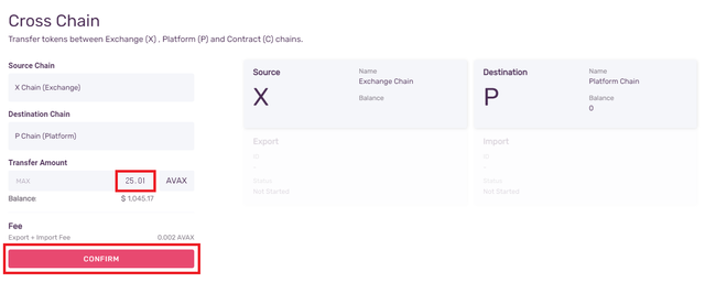 ④ Transfer Amount란에 P-Chain으로 보낼 AVAX 토큰의 수량을 입력합니다.