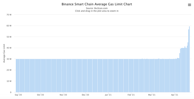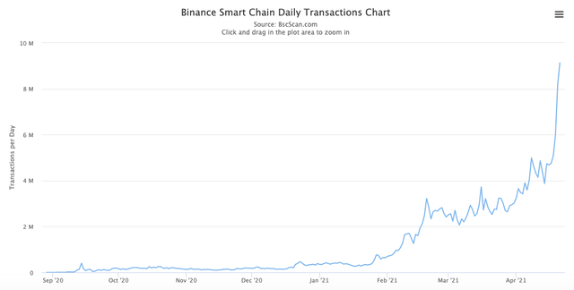 지난 4월말에 일일 트랜잭션이 9.1M을 돌파하면서 엄청난 수요가 증가하고 있으며 이에 따라 BscScan과 바이낸스 체인 커뮤니티에서는 BSC 사용 시에 표준 가스 비용인 5gwei 이상으로 설정할 것을 권장하는 캠페인을 진행하기도 했습니다.