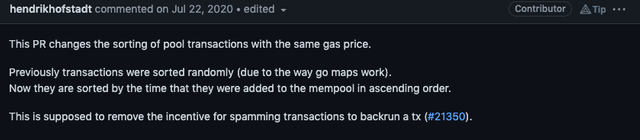 이더리움의 핵심 개발자는 바이낸스 스마트 체인이 런칭하기 전에 시간 기반 트랜잭션 정렬 기능을 도입하였으나, Pull Request 전에 BSC가 포크를 진행하였고 따라서 BSC에서는 동일한 가스 수수료의 트랜잭션의 경우 mempool에서 무작위로 정렬이 되는 문제가 있다는 것입니다.