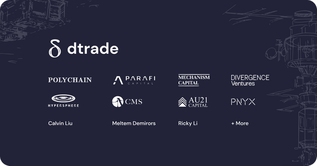 지난 3월에 Polychain Capital이 주도한 프리 시드 라운드(Pre-seed round)에서 이미 ParaFi, AU21, 컴파운드의 Calvin Liu 등으로부터 투자를 유치한 바 있는 dTrade에는 Alameda Research, CMS Holdings, Wintermute, MGNR 등이 유동성을 지원할 예정이며 Amber Group의 Tiantian Kullander가 팀 어드바이저로 합류할 예정입니다.