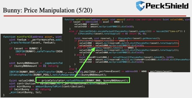 해당 해킹 사건은 Uniswap v2의 포크인 팬케이크스왑에 남아 있는 플래시론 기능과 오라클 데이터를 기반으로 LP토큰(BNB-USDT, BNB-BUNNY)의 가치를 측정하는 버그를 악용한 것으로 해당 해킹으로 인해 개당 약 150달러에 해당하던 BUNNY토큰의 가격이 약 1.8달러 수준까지 한순간에 급락하게 되었습니다.