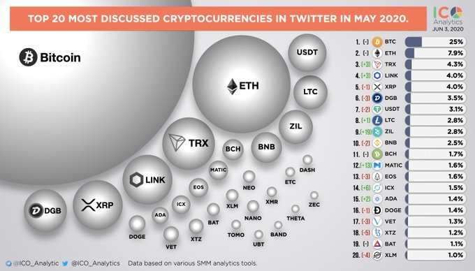 디지털자산들의 주요 정보를 요약적으로 참고할 수 있는 유용한 자료를 제공하는 ICO Analytics에서 지난 5월 동안 트위터에서 가장 많이 언급된 TOP20 디지털 자산 리스트를 발표하였습니다.