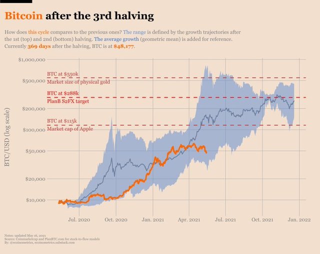 비트코인의 첫 번째 반감기 이후의 움직임, 두 번째 반감기 이후의 움직임을 가지고 3번째 반감기 이후의 비트코인 가격을 예측하는 ecoinometrics의 자료에 따르면 아직까지 비트코인의 가격 흐름은 정상적인 범위 내에서 움직이는 중이라고 볼 수 있습니다.
