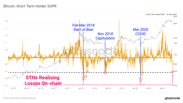 2018년 초 하락장의 시작시, 2018년 11월 커피출레이션(급락세에서 희망을 버리고 항복하듯이 모두 다 매도에 나서는 상황), 2020년 3월 코로나 팬더믹 때의 숏텀 홀더들의 SOPR과 현재가 매우 비슷한 상황입니다.