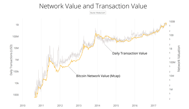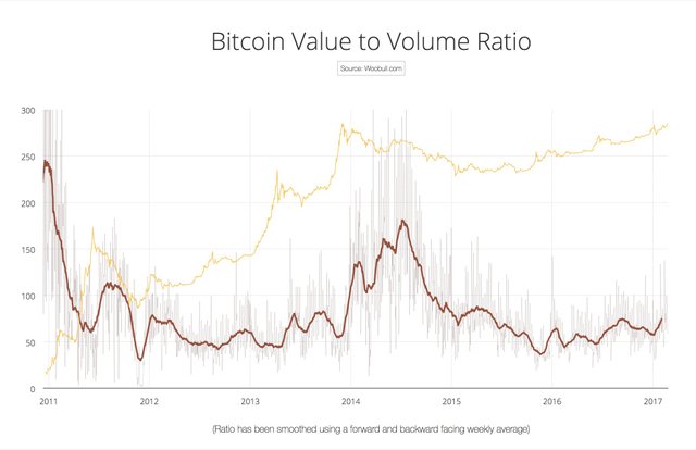 주식의 고평가/저평가 여부를 PER로 평가하는 것과 마찬가지로 Network Value to Transactions Ratio도 현재 비트코인의 가격이 고평가되어 있는지, 아니면 저평가되어 있는지를 객관적으로 따져볼 수 있는 지표로 사용될 수 있습니다.