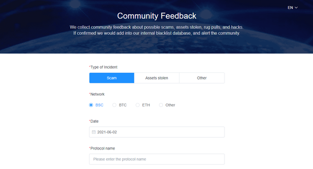 바이낸스 스마트 체인 생태계의 주요 보안 파트너사 중 하나인 PeckShield를 통해 스캠 프로젝트나 사기 의심이 가는 프로젝트를 보다 간편하게 신고할 수 있습니다. https://forms.coinholmes.com/ 사이트에 접속하여 의심스러운 프로젝트를 신고해주세요.