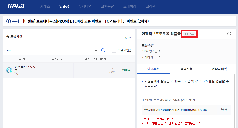 [입출금] 탭에서 출금을 하고자 하는 코인을 선택하고 위 이미지와 같이 ERC-20 이라는 마크가 보이는지를 확인하세요.