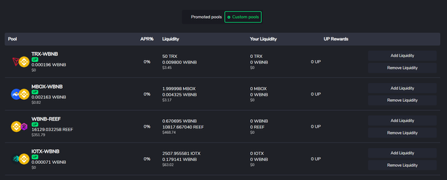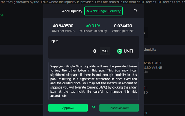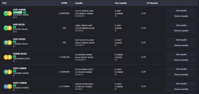 - 현재 바이낸스 스마트 체인에서 UNFI-WBNB 페어에 유동성을 공급하는 경우 UP토큰 보상에 추가적으로 보너스 보상을 받게 됩니다