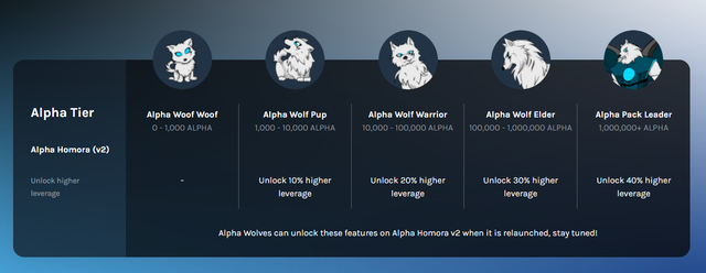 알파 파이낸스에서는 ALPHA토큰을 스테이킹하고 있는 커뮤니티 멤버들을 Alpha Wolf라고 지칭하고 있는데, 각각의 티어에 해당하는 스테이커들은 수수료 보상을 받을 뿐만 아니라, 스테이킹 수량에 따라 레버리지를 이용할 수 있는 한도도 증가하게 됩니다.