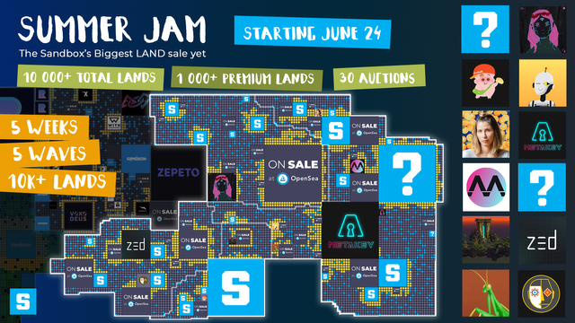 써머 잼의 첫 번째 웨이브가 진행되는 6월 24일에는 일반LAND 810개, 프리미엄LAND 270개가 판매될 예정이며, 파트너로는 Hashmasks, ZED RUN이 참여합니다.