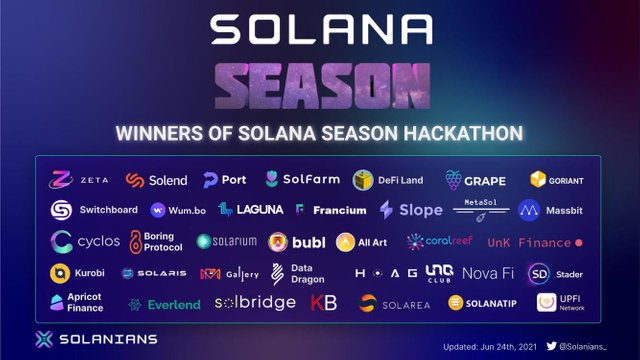 안녕하세요, 디온입니다. 지난 2021년 5월 15일부터 6월 7일까지 진행되었던 솔라나 시즌 해커톤의 우승팀들이 발표되었습니다. 솔라나 생태계 성장의 가속화를 위해 Solana Foundation에서 사상 최대 규모로 진행한 이번 온라인 해커톤에는 13,000명 이상의 참가자와 350개 이상의 프로젝트들이 참여하였습니다.