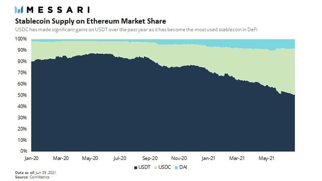 얼마 전 Messari에서 발표한 자료를 살펴보면 이더리움 기반 스테이블코인의 시장점유율에서 테더(USDT)가 지속적인 하락세를 보이며 사상 최초로 50% 이하의 점유율을 기록할 것으로 예상되는 반면 USDC의 점유율이 비약적으로 상승하고 있는 것을 확인할 수 있는데요.