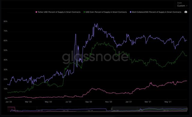 참고로 테더(USDT)의 경우에는 이더리움, 트론, EOS, 알고랜드, OMG까지 총 5개의 체인을 지원하고 있으며, USDC와 USDT 모두 현재의 시장점유율은 이더리움이 압도적으로 높은 편인데 이는 이더리움 기반 DeFi 프로젝트들의 유저 점유율, 주요 거래소들의 ERC20 입출금 지원의 영향이 큰 것으로 보입니다.