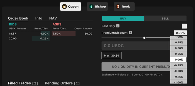 QUEEN 토큰은 BTCB를 활용하여 발행하는 것도 가능하고, USDC로 Exchange에서 구매를 하는 것도 가능합니다. 단 USDC로 QUEEN을 구매하는 경우에는 30분 단위로 도래하는 다음 Epoch가 종료된 후에 실제 구매가 이뤄집니다.