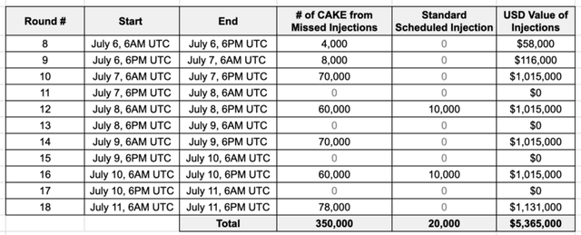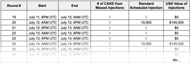 7월 12일 15시부터 시작되는 20라운드부터는 2일 간격으로 10,000 개의 CAKE 토큰이 정기적으로 배정됩니다.