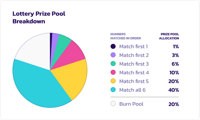 Lottery v2의 상금 풀은 위와 같이 나눠지며, 6자리의 모든 숫자가 매칭되는 경우에는 최대 상금 풀의 40%를 받게 됩니다.