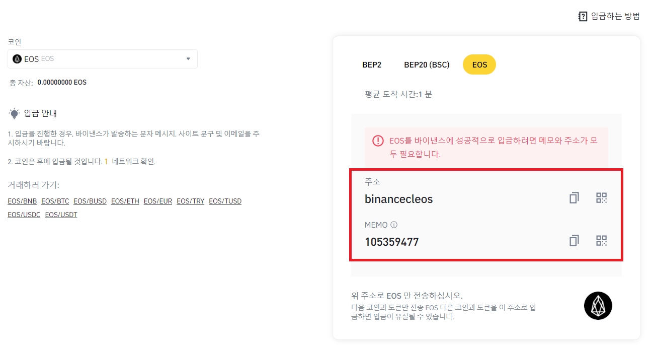 ② 메모 : MEMO는 binancecleos라는 지갑으로 들어온 EOS가 어떤 바이낸스 고객의 물건인지를 식별하는 고유번호입니다. 따라서 절대 MEMO를 빠뜨리거나 잘못 기입하지 않도록 주의해야 합니다.