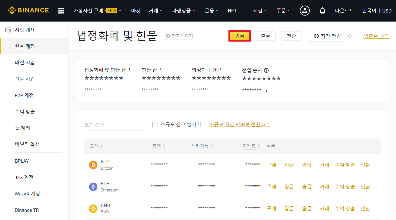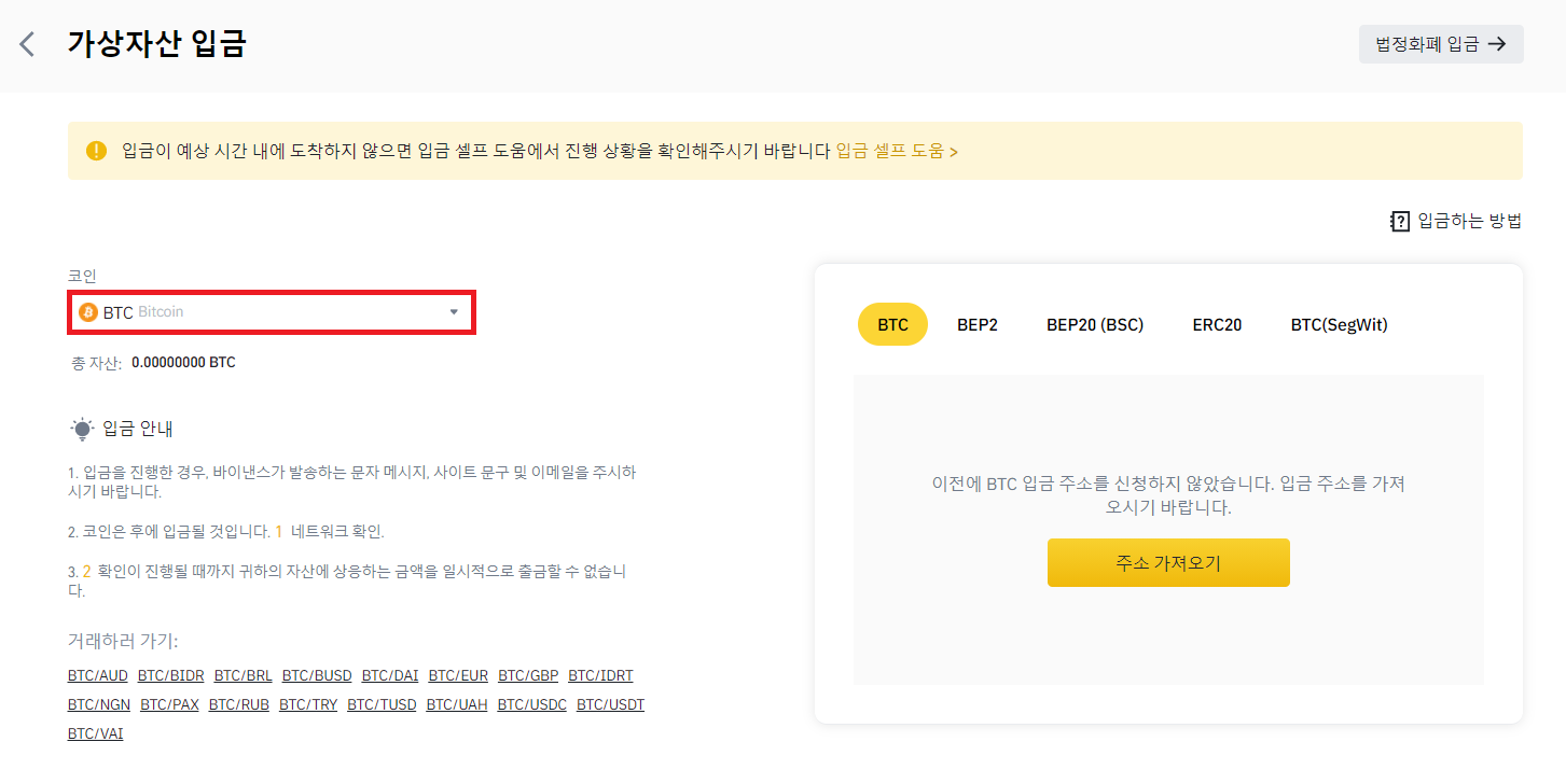 그 다음 노란색으로 된 [입금] 버튼 순으로 클릭하면 위에서 설명한 화면을 찾을 수 있습니다. 만약 이 방법으로도 못 찾는 경우에는 https://www.binance.com/ko/my/wallet/account/main 링크를 입력하시어 접속하시면 지갑으로 이동할 수 있습니다.