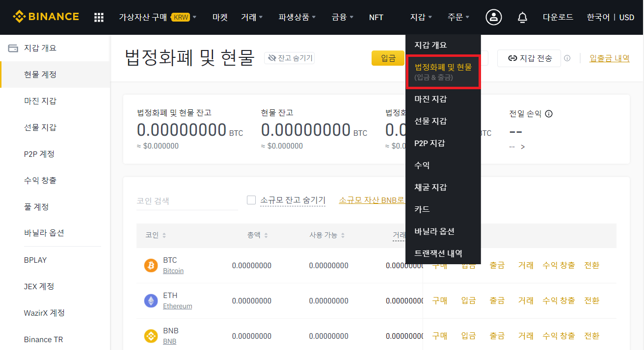 화면 상단 [지갑] 클릭 → [법정화폐 및 현물] 클릭