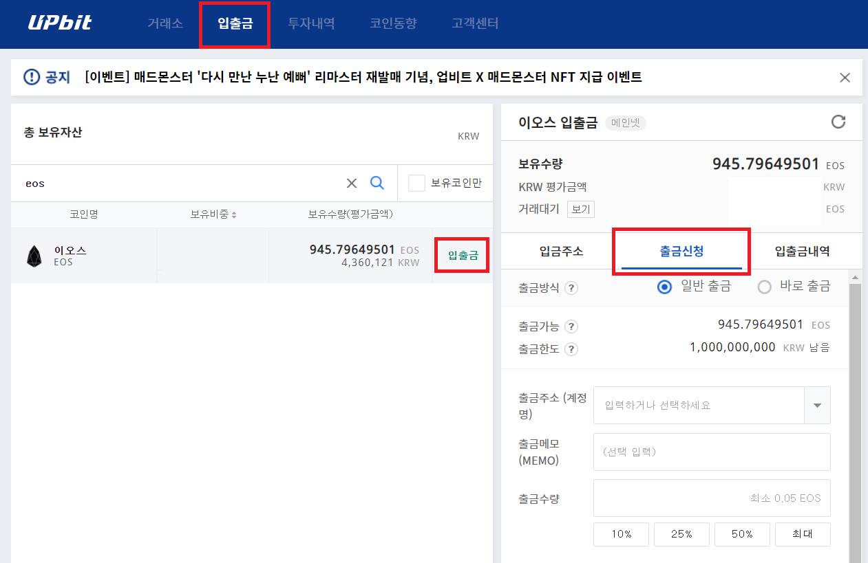 ① 입출금 → EOS 검색 후 우측의 [입출금] 클릭 → [출금신청] 탭 클릭