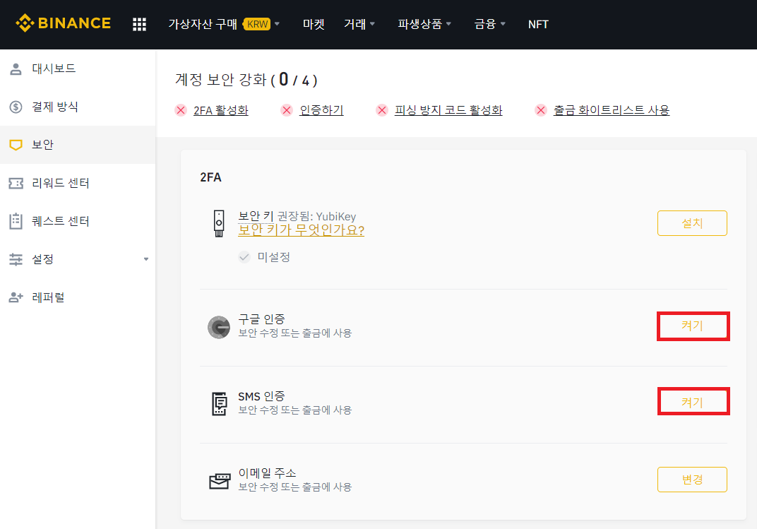 우선은 사용 중인 이메일의 로그인 비밀번호와 바이낸스 거래소 로그인 비밀번호를 다른 걸로 설정하셔야 하며, 반드시 [보안] 탭으로 이동을 하시어, 여러가지 안전장치 설정을 하셔야 합니다.