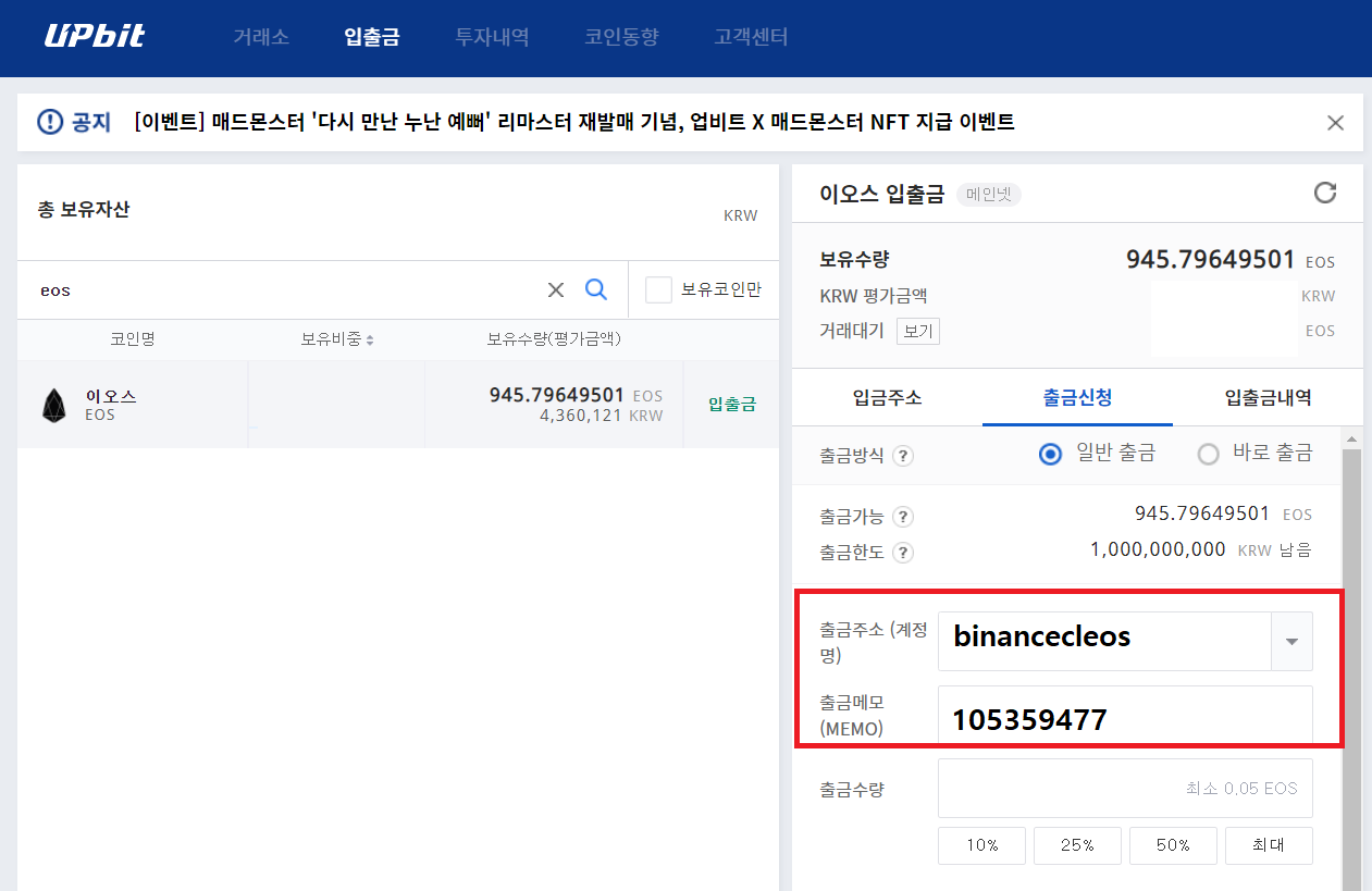 이제 국내 거래소에서 방금 확인한 지갑 주소로 EOS를 보내봅시다. 아래의 설명은 업비트를 기준으로 설명하며 어느 거래소든 출금 방법에는 크게 차이가 없으니 참고하시면 되겠습니다.