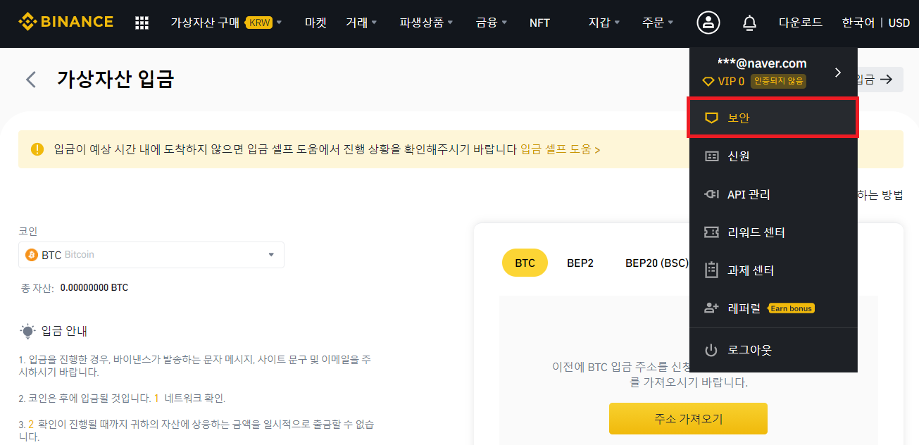 가입이 완료되면 위와 같은 화면이 나타나는데 우리는 국내 거래소에 보유 중인 코인(가상자산)을 바이낸스로 전송하여 거래를 시작해야 합니다.