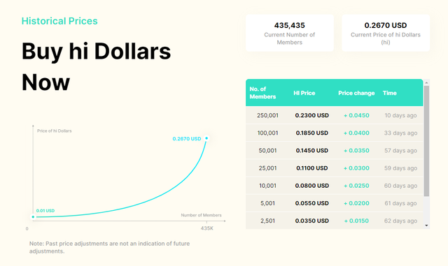 현재 하이에서는 하이 플랫폼의 네이티브 토큰으로 사용될 하이 달러(hi Dollar)의 프리세일을 진행하고 있는데, BNB, BUSD, BTC, DAI, DOGE, ETH, LTC, USDT, USDC, TUSD 등으로 구매가 가능하며 위와 같이 계속해서 가격이 올라가게끔 설계가 되어 있다고 광고를 하고 있습니다.