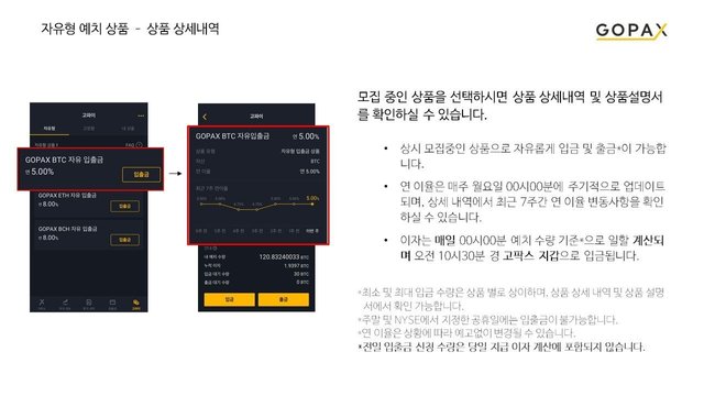 오늘 자유입출금 상품 출시 공지와 함께 현재는 비트코인(BTC)의 연이자율 3% 자유형 상품 1개가 출시되어 있으며, 지금까지의 고정형 상품과는 달리 고팍스 거래소 지갑에 보유 중인 BTC를 언제든 자유롭게 넣고 빼고가 가능합니다.