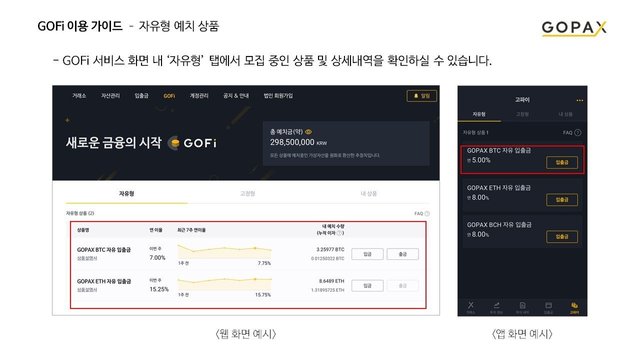거래소 지갑에 보유 중인 가상자산(암호화폐)을 활용하여 보유 기간 중의 이자수익을 제공하는 씨파이(CeFi)가 전무한 한국 암호화폐 거래소 생태계에서 이번 고파이(GOFi)의 자유입출금 상품의 출시 소식은 큰 의미를 가진다고 할 수 있습니다.