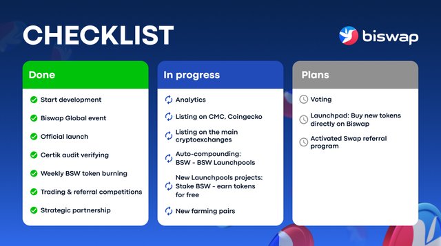 Biswap은 출시 이후 굉장히 빠른 속도로 로드맵을 달성해나가고 있으며, 앞으로 중요한 것은 여러 프로젝트들과의 파트너십을 통한 BSW 스테이킹 풀의 다양화, 그리고 다양한 경쟁사들과 차별화될 수 있는 런치패드의 성공 여부가 남아 있는 것으로 보입니다.