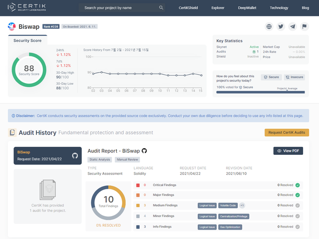 써틱의 보안 감사 점수 기준으로도 꽤나 점수가 높은 편이고, 최근 들어 지속적으로 써틱의 Trending Projects에도 랭크가 되는 것으로 보아 먹튀 등의 리스크는 낮은 편이 아닐까 생각이 됩니다.