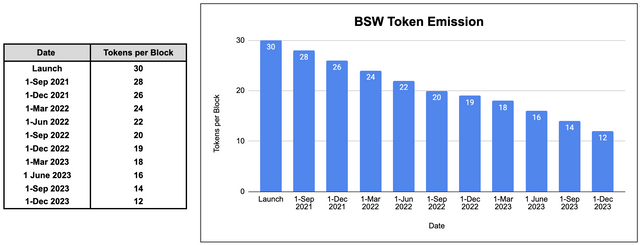 BSW토큰의 방출율은 2021년 9월 1일부터 매월 블록당 2개씩이 감소하게 되며, 레퍼럴 링크 없이 가입한 계정들에게 돌아가야 할 보상은 BSW토큰의 바이백 및 소각에 사용됩니다. 더불어 거래 수수료의 50%는 토큰 소각에 사용됩니다.