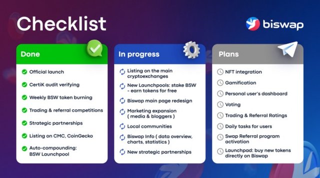 안녕하세요, 디온입니다. 얼마 전 포스팅을 통해 소개드렸던 제2의 팬케이크스왑을 목표로 하는 바이낸스 스마트 체인(BSC) 기반의 Biswap에서는 주기적으로 체크리스트를 통해 지금까지 진행이 완료된 사항과 향후 계획 등에 대해 공개를 하면서 커뮤니티와 꾸준하게 소통을 하고 있습니다.