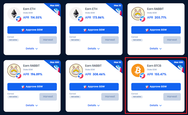 여기에 오늘은 새롭게 비트코인(BTC)이 추가되었으며, 비록 한도가 각각 10 BSW, 500 BSW로 한정되어 있으나, 소액으로 묵혀놓고 파밍하기에는 이만큼 좋은 풀은 없는 것 같습니다.