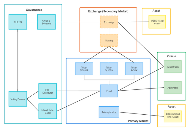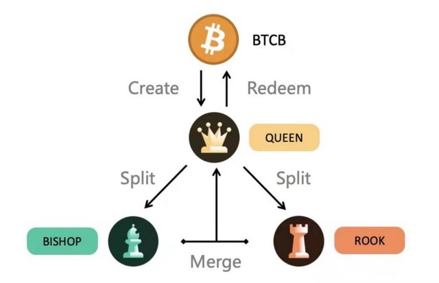 모든 암호화폐를 추적하는 메인 펀드 토큰인 QUEEN은 현재는 비트코인(BTC)만 지원하고 있으며, BISHOP과 ROOK이라는 토큰으로 5:5로 분할이 가능합니다. BISHOP은 BTC의 가격을 추종하지 않은 USDC와 같은 스테이블코인으로서의 역할을 하고, ROOK은 비트코인의 가격 변동성을 2배로 추적하는 레버리지토큰으로서의 역할을 합니다.