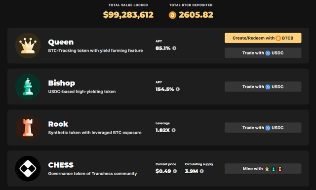 체스 게임에서 영감을 받아 2020년부터 개념 설계 및 개발이 시작되었던 Tranchess는 단일 메인 펀드에서 다른 수준의 리스크와 수익 매트릭스를 제공하는 자산 관리 플랫폼으로서 역할하는 것을 목표로 출시가 되었으며 플랫폼에는 QUEEN, BISHOP, ROOK, CHESS라는 4가지 토큰이 사용됩니다.