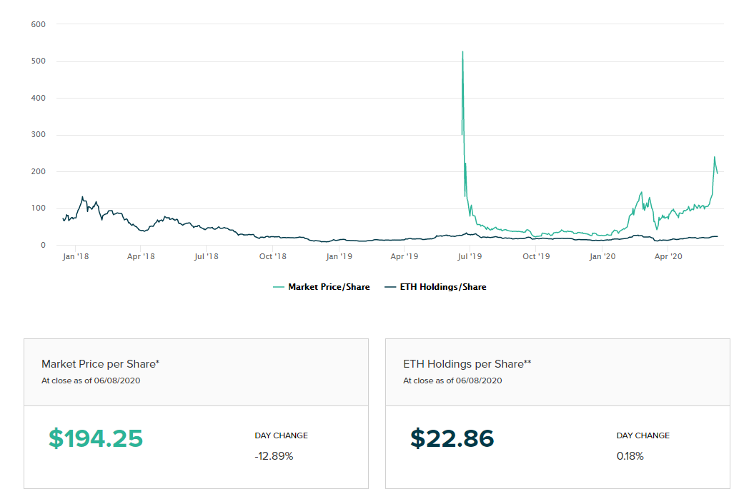 그런데 재미있는 점은 실제 ETHE의 Market Price per Share에 엄청난 프리미엄이 붙은 채로 거래가 되고 있다는 점입니다.