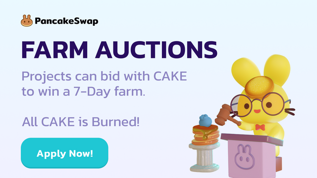 각 프로젝트들은 팜 운영권 획득을 위해 CAKE토큰을 모아서 옥션에 입찰을 할 수 있으며, 최종적으로 입찰이 되는 경우 입찰에 참여된 CAKE는 전액 소각이 되는 방식입니다.