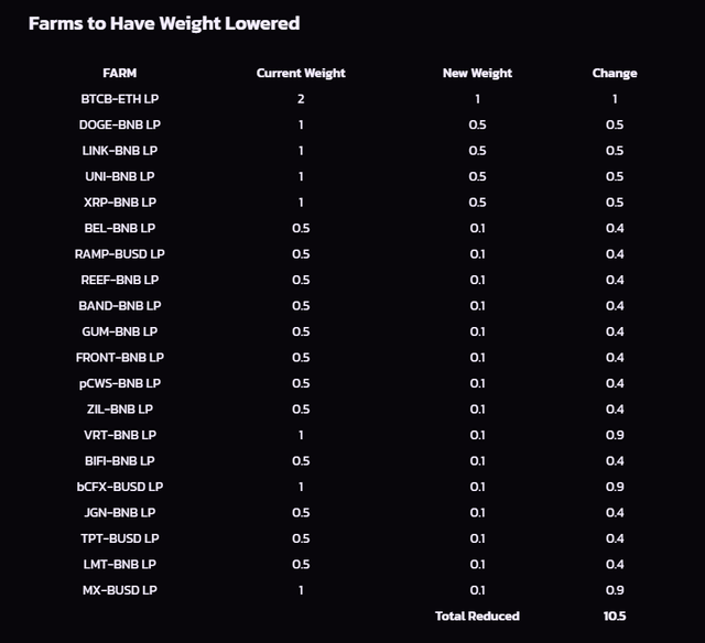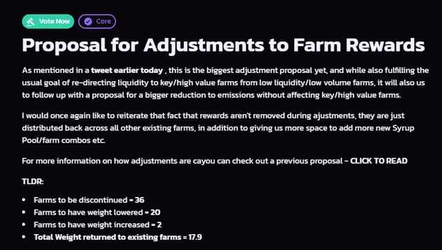 유동성과 거래량이 많이 줄어든 올드 팜들은 기본적으로 지난 거버넌스 투표를 통해 1차적으로 가중치가 급격하게 줄어든 바 있으며, 이번 프로포절이 통과되는 경우 36개 팜의 CAKE 채굴이 종료되며 총 7.4의 가중치가 빠져나오게 됩니다.