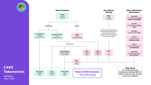 CAKE토큰은 팬케이크스왑에서 발생하는 모든 거래의 0.05%, IFO를 통해 모금된 수량의 50%, 프로필과 NFT 생성에 사용된 100%, 복권 추첨에 소비되는 수량의 20%, 프리딕션 마켓에서 발생하는 수입의 3%, Auto CAKE풀에 있는 모든 수확량의 2% 등 다양한 소각 메커니즘을 통해 하루 CAKE 인플레이션량을 약 50만 개 수준으로 유지해오고 있습니다.