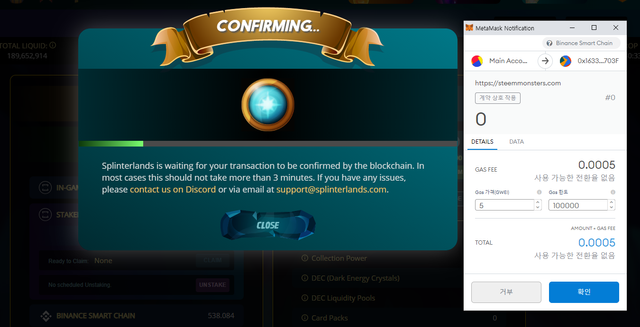 - 위와 같이 메타마스크 팝업창에서 승인을 완료하고 잠시 기다리면 12 컨퍼메이션 후 내 스플린터랜드 게임 계정으로 SPS토큰이 들어오는 것을 확인하실 수 있습니다