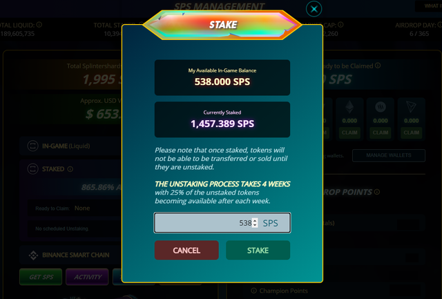 - 내 지갑으로 SPS가 들어왔으면 STAKE버튼을 클릭한 뒤에, 스테이킹을 원하는 수량을 입력하고 다시 한 번 STAKE 탭을 클릭하시면 됩니다