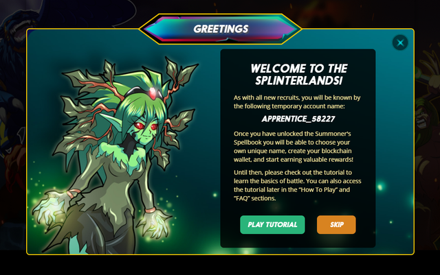 - 위와 같은 화면이 나왔다면 스플린터랜드 계정 생성이 모두 완료된 것입니다. 별도로 게임 튜토리얼을 확인할 것이 아니면 SKIP버튼을 누르세요.