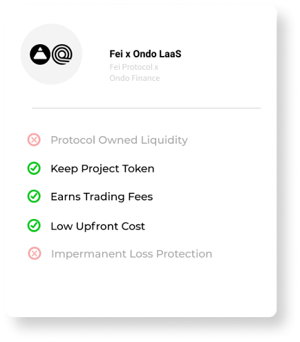 페이 프로토콜은 Ondo Finance와의 파트너십을 통해 비용 효율적이고 기간의 제한이 없는 유연한 방식의 유동성 서비스를 제공합니다. 기본적으로 프로젝트는 원하는 기간 동안 프로젝트 토큰을 Ondo 유동성 볼트에 예치할 수 있으며 페이 프로토콜은 해당 예치금을 새로 발행된 FEI와 매칭하여 유동성 페어를 형성합니다. 토큰은 Uniswap 또는 Sushiswap과 같은 AMM에서 페어링됩니다.