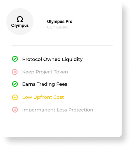 Olympus Pro는 OlympusDAO 채권 메커니즘을 활용하여 프로젝트에 자체 프로토콜 소유 유동성을 얻을 수 있는 기회를 제공합니다. 프로젝트는 할인된 가격으로 토큰을 원하는 모든 종류의 LP토큰 또는 네이티브 자산으로 교환할 수 있습니다. 이는 프로젝트가 머시너리 캐피탈의 유동성을 유지하지 못하는 기존 유동성 채굴 프로그램에 비해 크게 개선된 방식입니다.